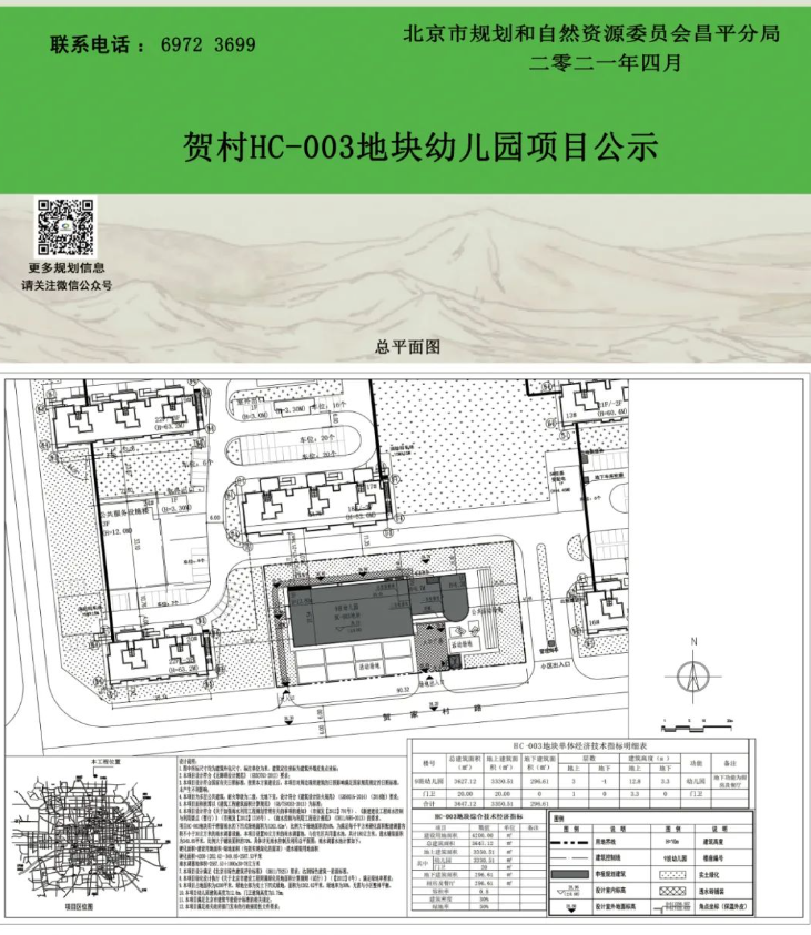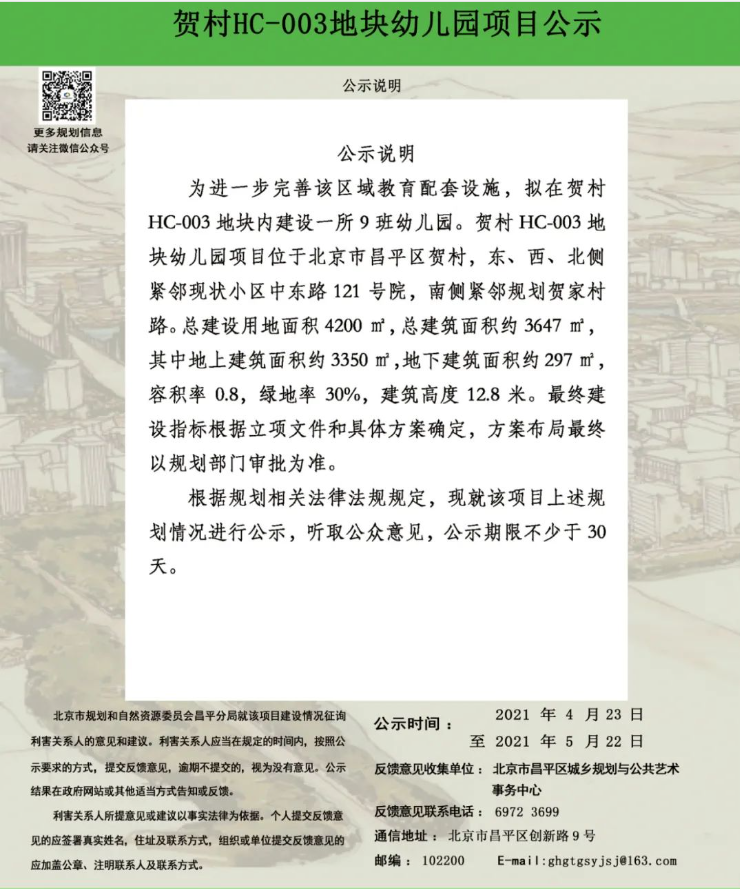 为进一步完善该区域教育配套设施,拟在贺村HC-003地块内建设一所9班幼儿园。贺村HC-003地块幼儿园项目位于北京市昌平区贺村,东、西、北侧紧邻现状小区中东路121号院,南侧紧邻规划贺家村路。总建设用地面积4200㎡,总建筑面积约3647㎡,其中地上建筑面积约3350㎡,地下建筑面积约297㎡,容积率0.8,绿地率30%,建筑高度12.8米。最终建设指标根据立项文件和具体方案确定,方案布局最终以规划部门审批为准。
