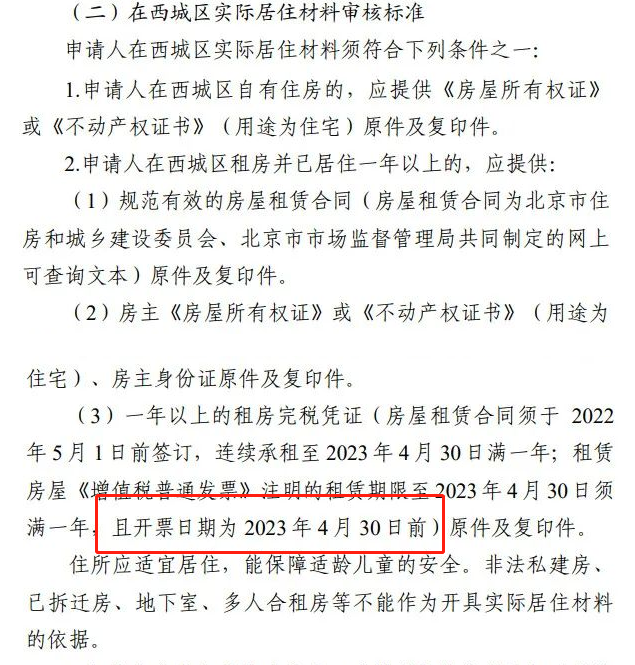 2023年西城区非本市户籍适龄儿童少年入学审核实施细则发布,其中要求西城区非京籍租房完税证明需要在4月30日办理: