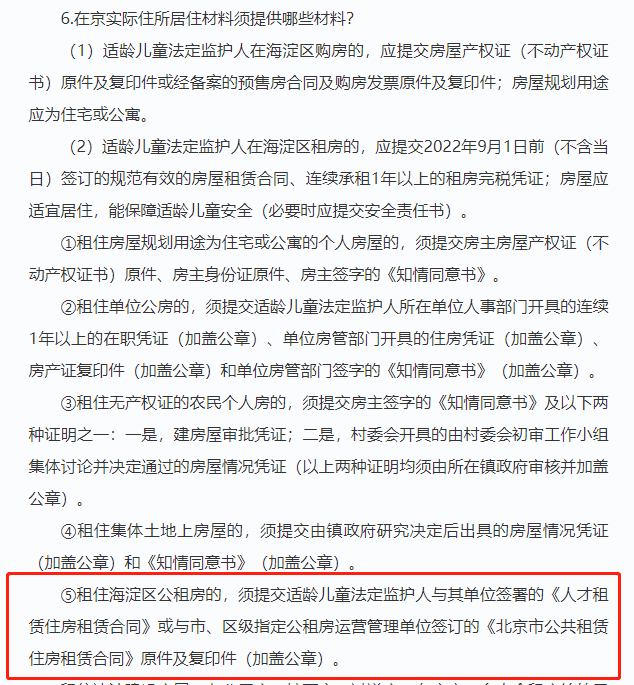 租住海淀区公租房的,须提交适龄儿童法定监护人与其单位签署的《人才租赁住房租赁合同》或与市、区级指定公租房运营管理单位签订的《北京市公共租赁住房租赁合同》原件及复印件(加盖公章)。