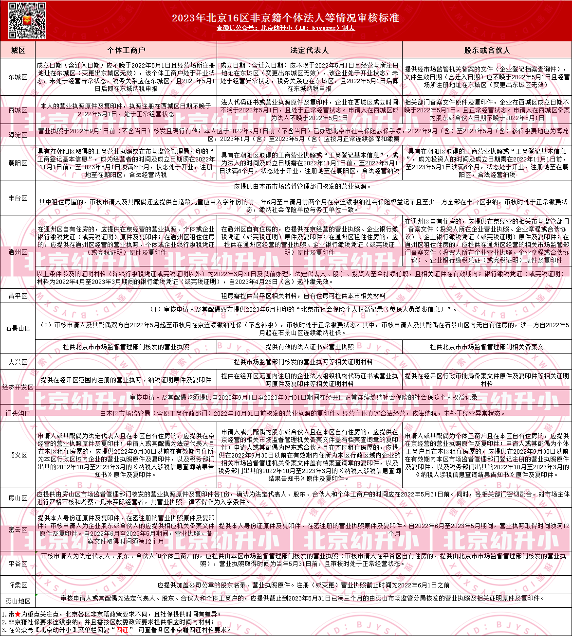 2023年北京幼升小16区非京籍审核细则要求不同,其中非京籍为个体工商户、公司合伙人等,需提供营业执照,北京幼升小网团队为你分享2023年非京籍幼升小16区营业执照要求汇总相关内容。