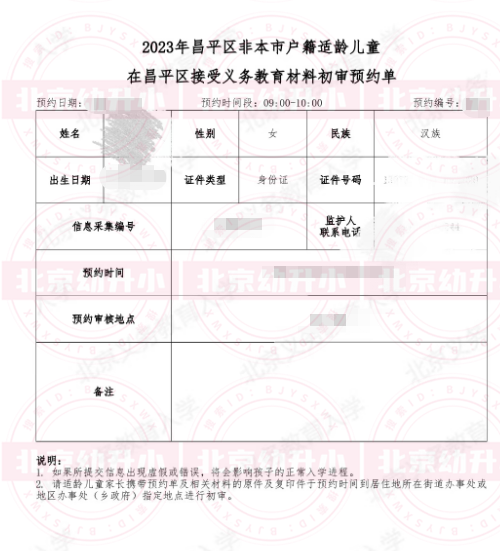 昌平区非京籍家长等待审核通过后,需携带昌平区非本市户籍适龄儿童在昌平区接受义务教育材料初审预约单前往进行街道办审核预约,预约单及审核预约结果成功样式如下: