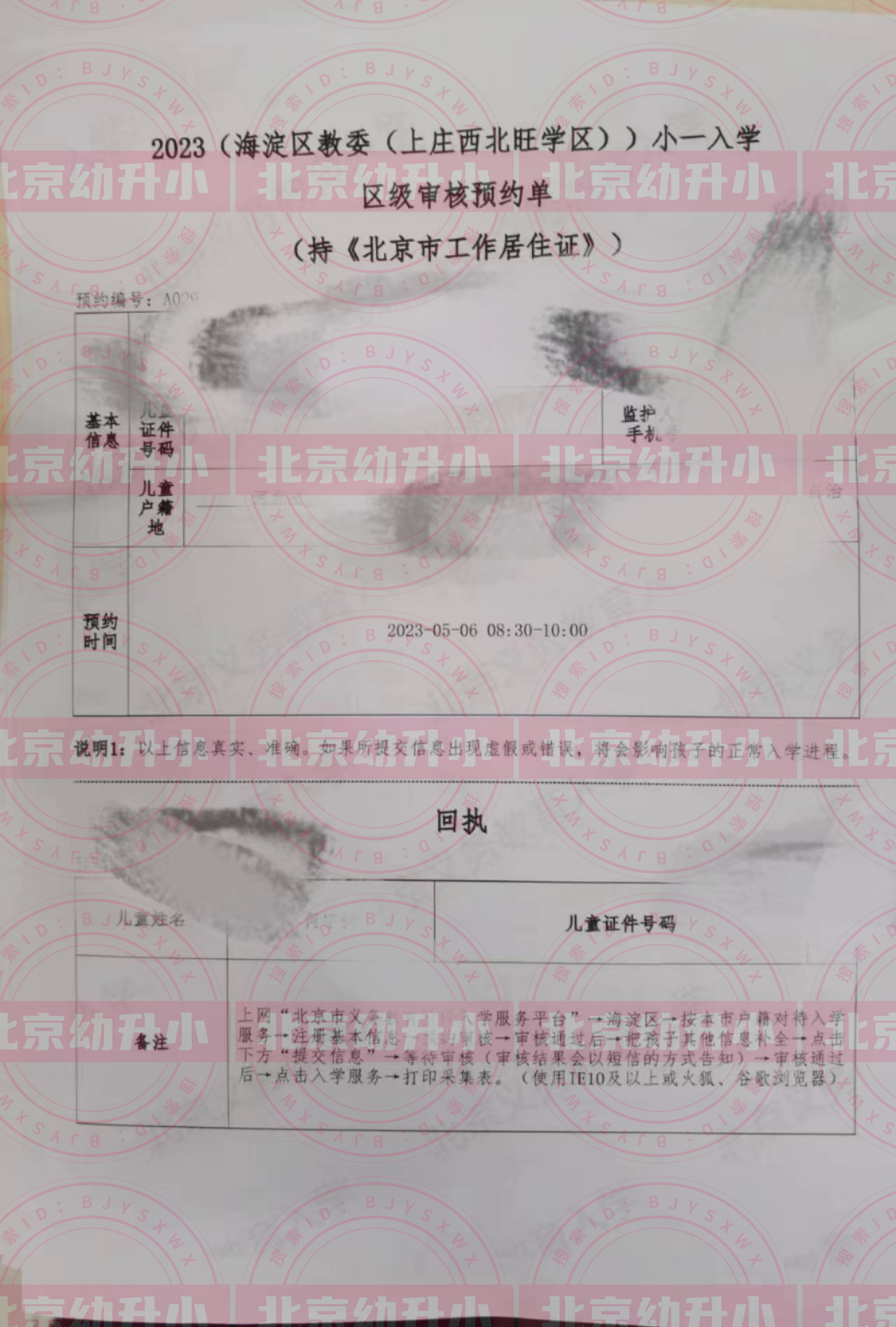 2023年幼升小海淀区上庄西北旺学区北京工作居住证区级审核预约单