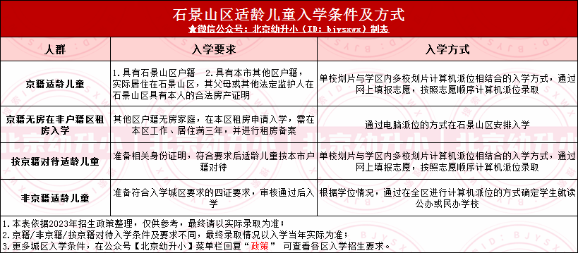 1、以上为2023年石景山区京籍、非京籍、无房京籍在非户籍区租房入学、按京籍对待适龄儿童入学方式;