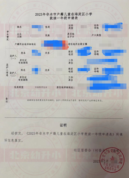 2023年幼升小海淀区非京籍信息采集审核通过后打印《2023年幼升小海淀区非京籍就读一年级申请表》,前往居委会进行材料初审,审核通过后签字盖章,更多海淀区非京籍入学流程,北京幼升小网团队为您分享相关内容。