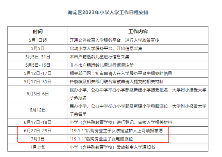 提醒:2023年海淀区1911家长在6月27日-29日通过志愿填报的方式进行入学。
