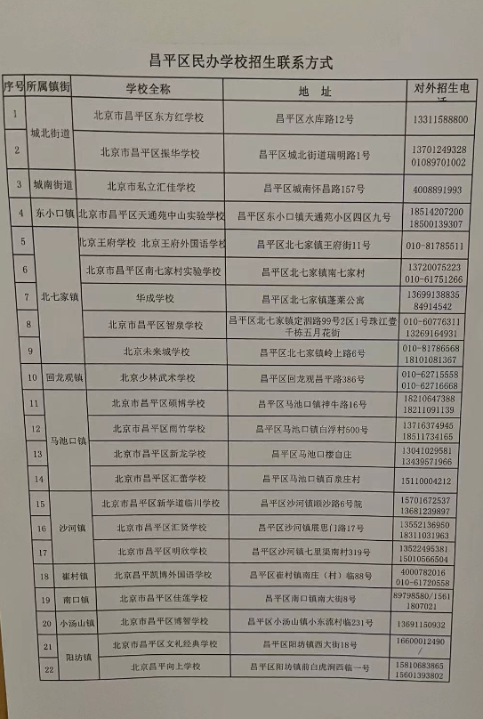 2023年昌平区民办校学校名单及详细地址、联系电话