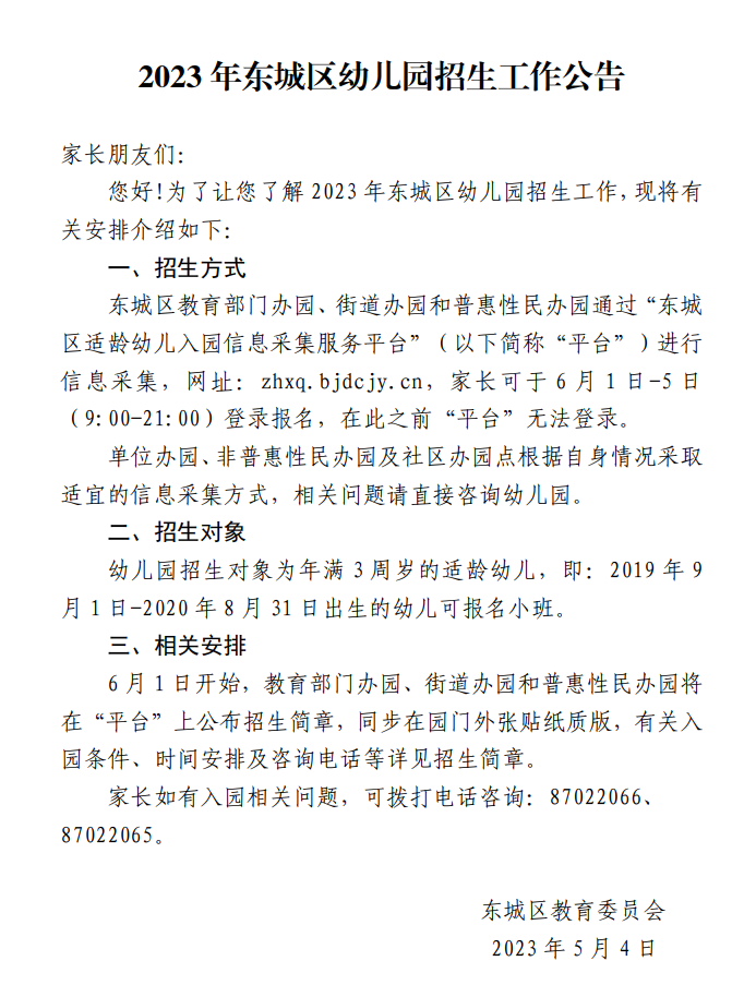 幼儿园入园家长注意,2023年东城区幼儿园招生公告发布啦,赶紧与北京幼升小网团队(ID:bjysxwx)一起来看看详细内容!
