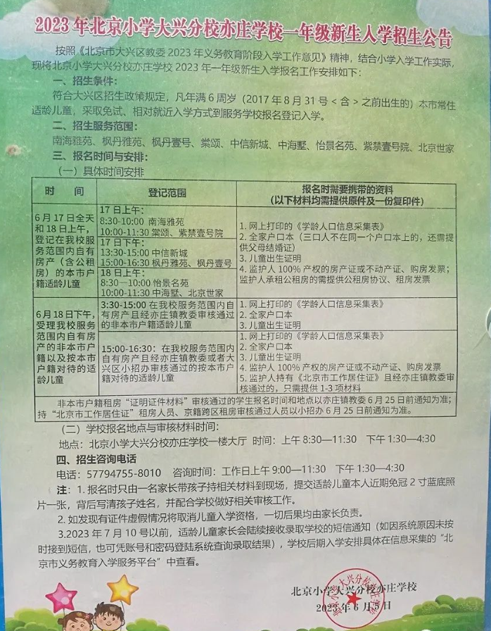 2023年大兴区北京小学大兴分校亦庄学校一年级新生入学招生公告