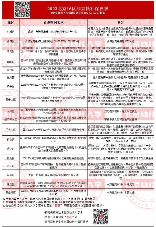 非京籍在北京幼升小需要提供四证材料,其中社保是在京务工就业证明中家长比较关心的材料之一,北京幼升小网团队整理各区2023年社保要求如下: