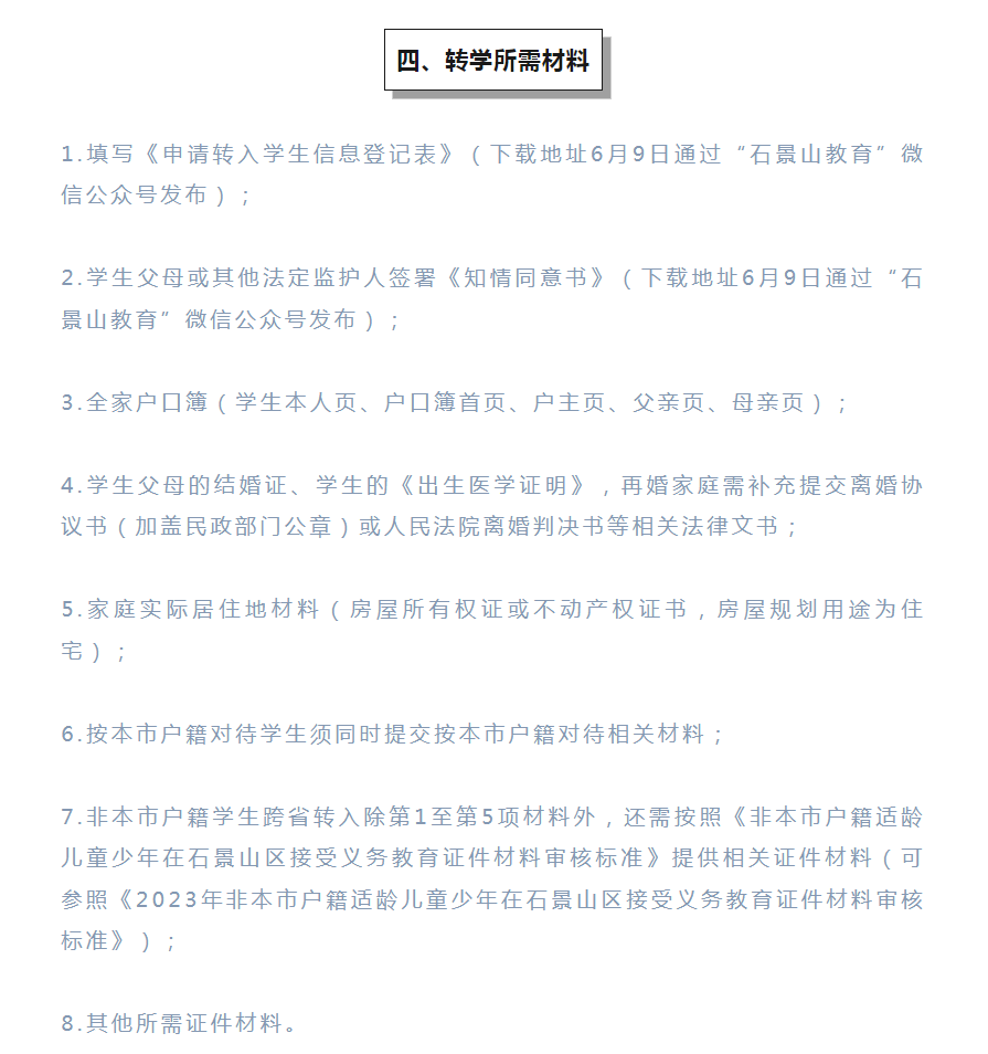 石景山区2022-2023学年第二学期义务教育阶段转学工作安排