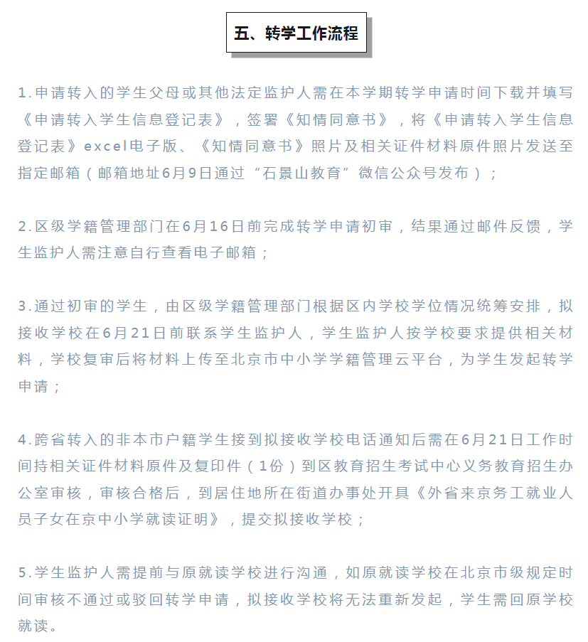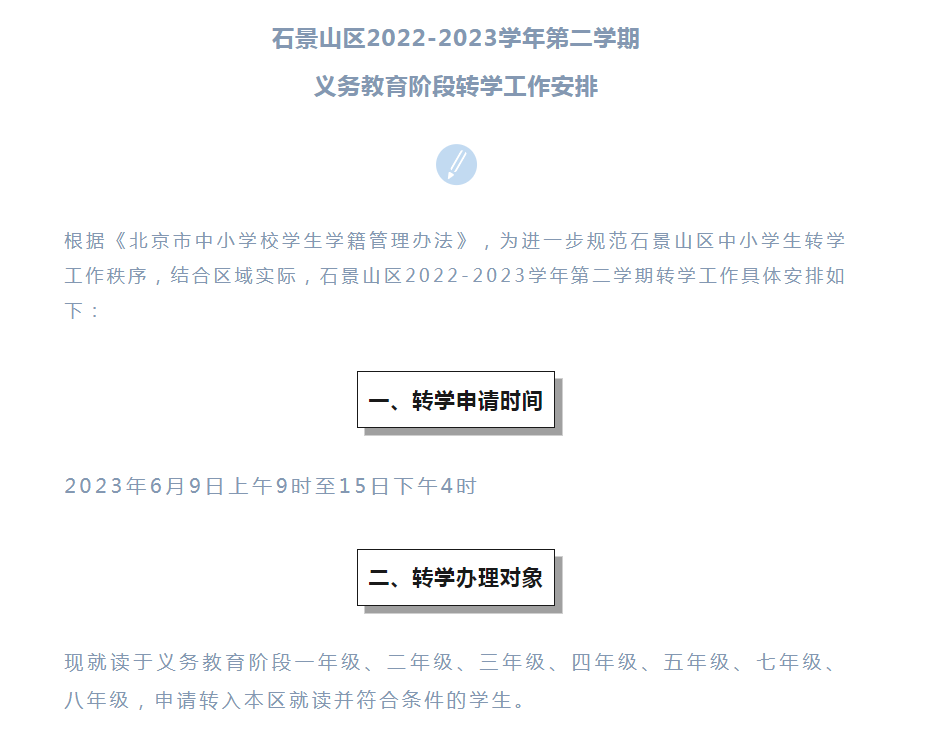 各位家长注意,石景山区发布2022-2023学年第二学期义务教育阶段转学工作安排,赶紧和北京幼升小网团队一起来看看详细内容!
