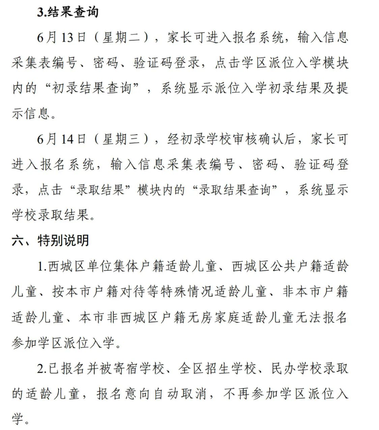 提醒:西城区幼升小家长注意,已被寄宿学校、全区招生学校、民办校、学区派位确认录取的,无法参加后续入学方式。如未被录取,不影响后续小学登记报名等入学方式。更多入学要求,关注“北京幼儿入学”进行查看!