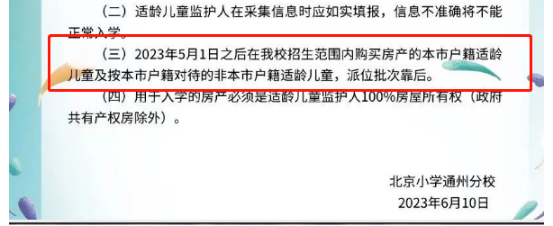 其中通州区多校联合派位入学办法中明确说明,2023年五一后购房京籍和按经济对待的非京籍,派位批次靠后!