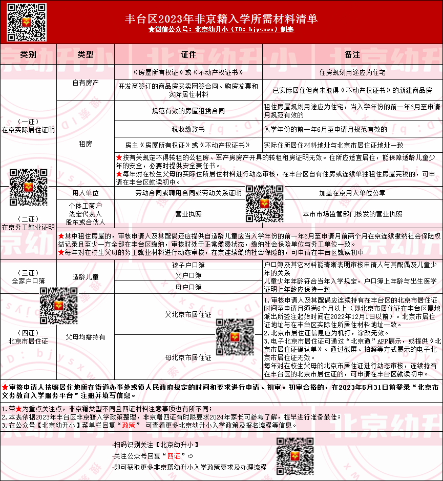 丰台区非京籍幼升小仍需准备“四证”材料,以下根据2023年入学要求整理,部分有时限要求,2024年家长可提前参考: