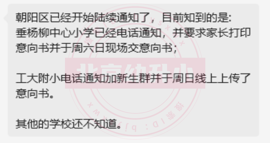 1.目前朝阳区已有家长收到录取消息,您请多加关注短信或电话通知,并根据学校要求上传/现场提交意向书。
