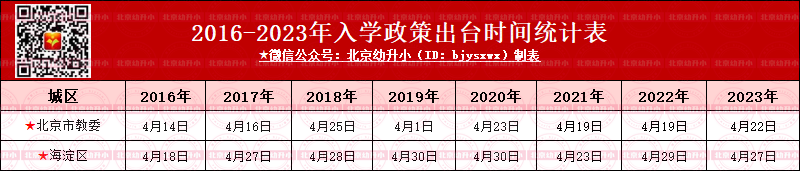 2024年海淀区入学政策暂未发布,参考往年集中于入学当年四月底,近几年海淀区入学政策发布时间参考如下: