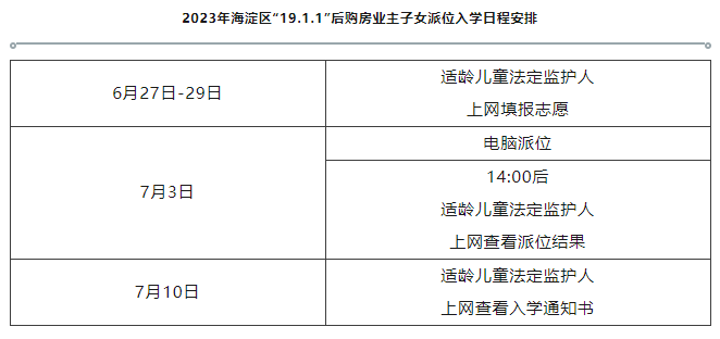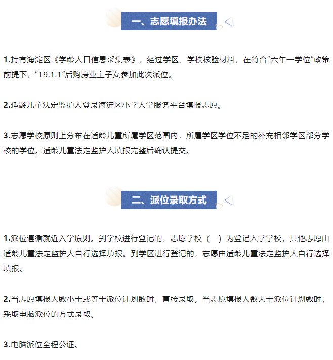 填报对象:持有海淀区《学龄人口信息采集表》,经过学区、学校核验材料,在符合"六年一学位"政策前提下,“19.1.1"后购房业主子女参加此次派位。