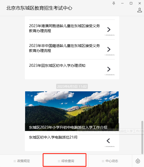 方法一:6月28日 15:00后 搜索“东城区教育招生考试中心”微信公众号-点击下方“综合查询”