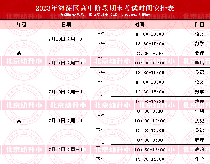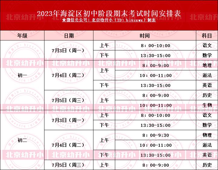 2023年海淀区中小学期末考试时间及科目安排