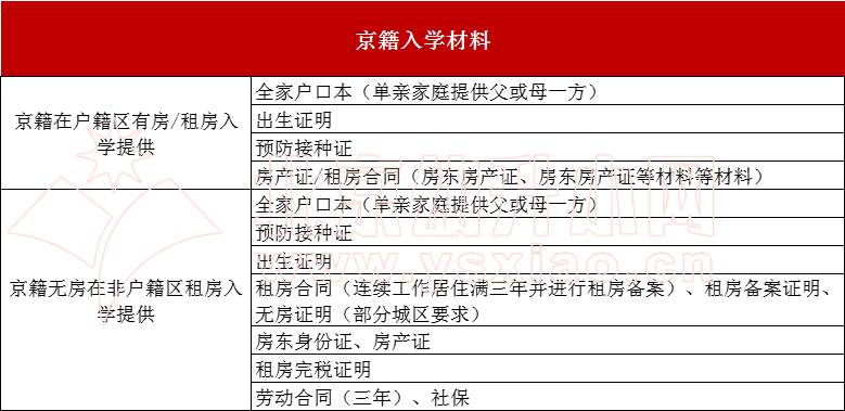 京籍幼升小一般分为在户籍区入学和京籍无房在非户籍租房上学等,情况不同所需材料也有所不同,家长可参考以下表格准备: