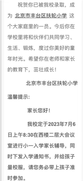 2023年丰台区小学录取结果可查,现在为您分享2023年幼升小丰台区扶轮小学录取通知书,针对收到录取通知书后接下来做什么进行了详细说明,北京幼升小网团队为您分享相关内容。