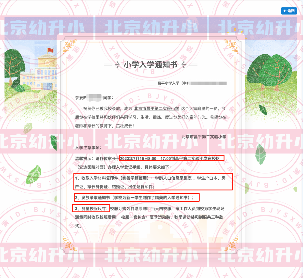 温馨提醒:各区详细要求不一致,详细要求可参考2023年北京各区小学录取通知书进行准备,同时建议您在到校时准备好黑色签字笔。