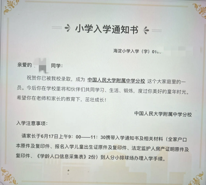 2023年幼升小北京各小学录取通知陆续发布,其中有家长分享了海淀区中国人民大学附属中学分校录取消息,北京幼升小网团队为您分享相关内容。