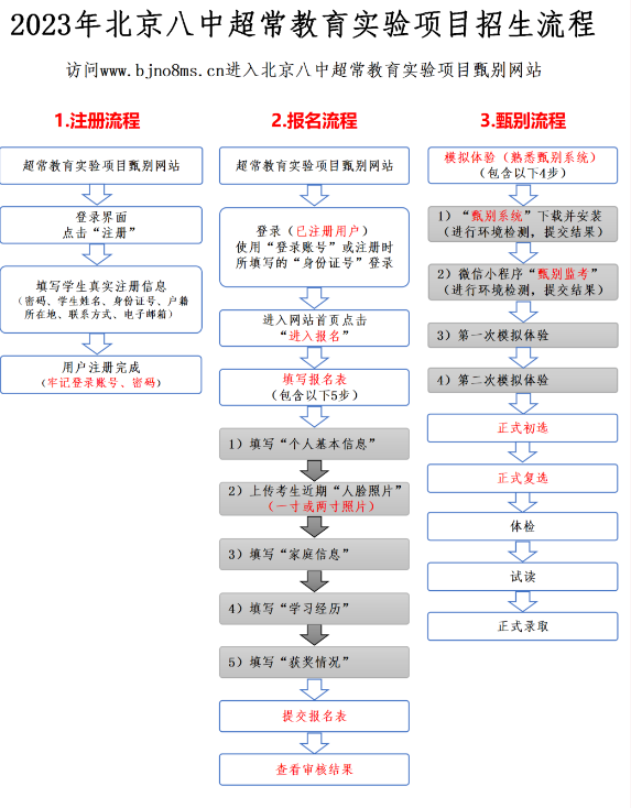 通过“报名甄别网站”进行报名,也可以通过“北京八中官网”-“招生专栏”进入报名甄别网站,具体填报流程详见“流程图”。