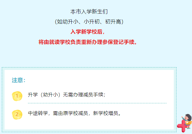 如果孩子是幼升小,升学时无需办理减员手续,由新学校重新办理参保手续即可;