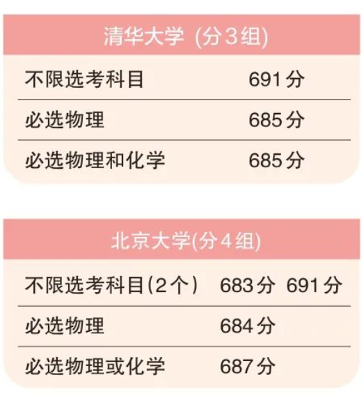 清华大学在京本科普通批录取中,投档线分为3组:不限选考科目的专业组投档线为691分,必选物理、必选物理和化学两个专业组的投档线均为685分。