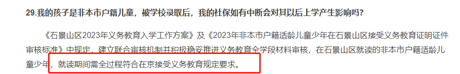《石景山区2023年义务教育入学工作方案》及《2023年非本市户籍适龄儿童少年在石景山区接受义务教育证明证件审核标准》中规定,建立联合审核机制并积极稳妥推进义务教育全学段材料审核,在石景山区就读的非本市户籍适龄儿童少年,就读期间需全过程符合在京接受义务教育规定要求。