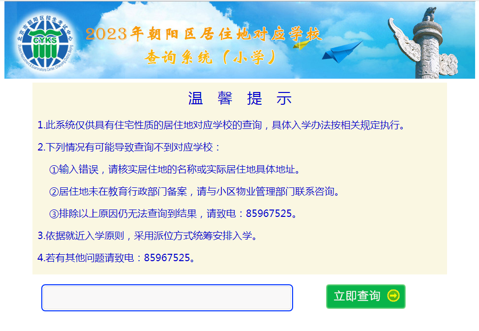 特别说明:朝阳区2023年居住地对应学校查询系统(小学)现在还可查询,2024年家长也可输入居住地址进行查询,最终还请以入学当年实际情况为准。