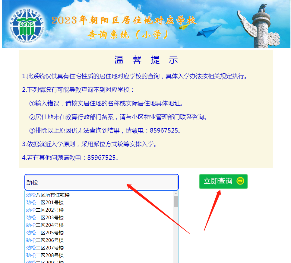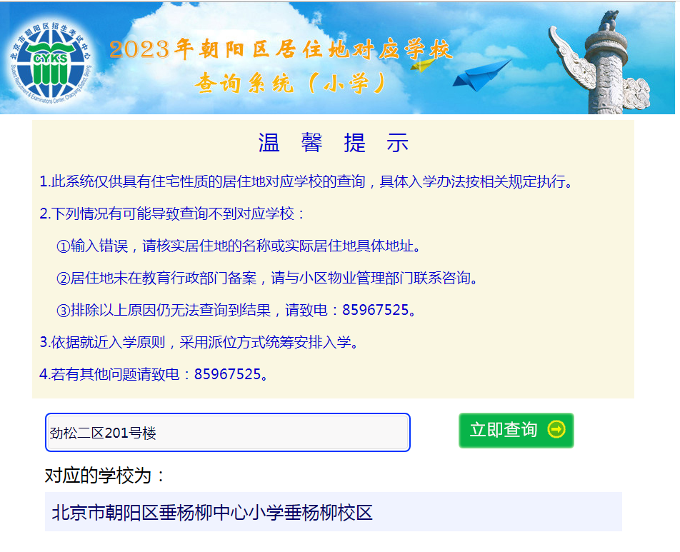 提醒:朝阳区幼升小入学家长,可输入实际居住地址即可查询划片学校,若您查询不到对应学校,可能为输错地址或居住地未在教育行政部门备案,建议您联系所在小区物业管理部门或致电图中联系方式咨询。