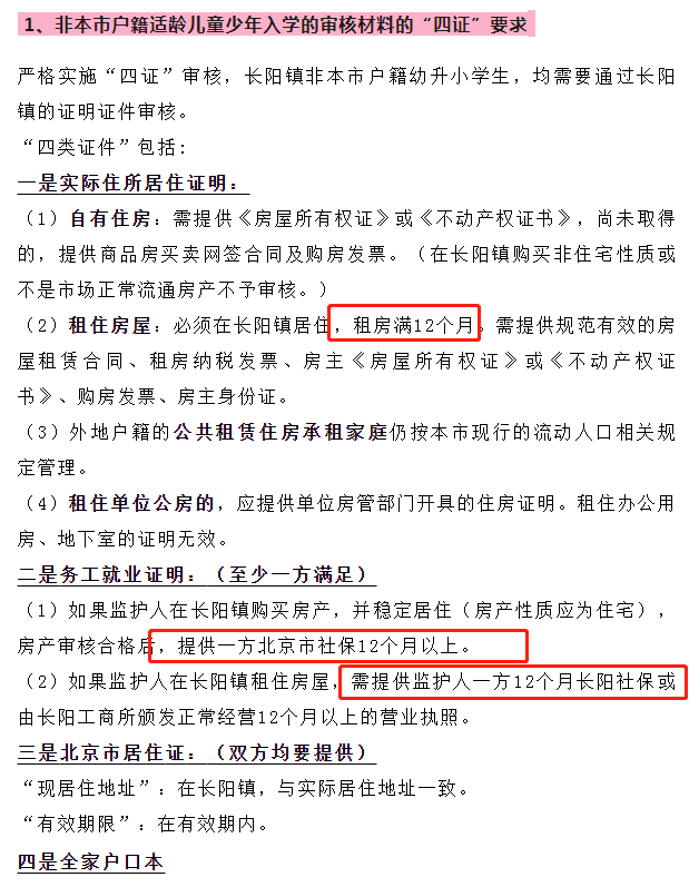 房山区长阳镇也发布了《致2024年长阳镇非本市户籍幼升小家长一封信》,其中明确了非京籍四证具体要求如下: