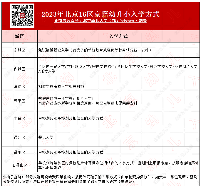 小柚子提醒:从如上要求来看,各区京籍孩子入学方式不同,一般为单校划片入学,但需注意部分城区有六年一学位和购房新政、户口迁移要求等,可能会影响孩子入学方式,