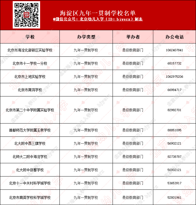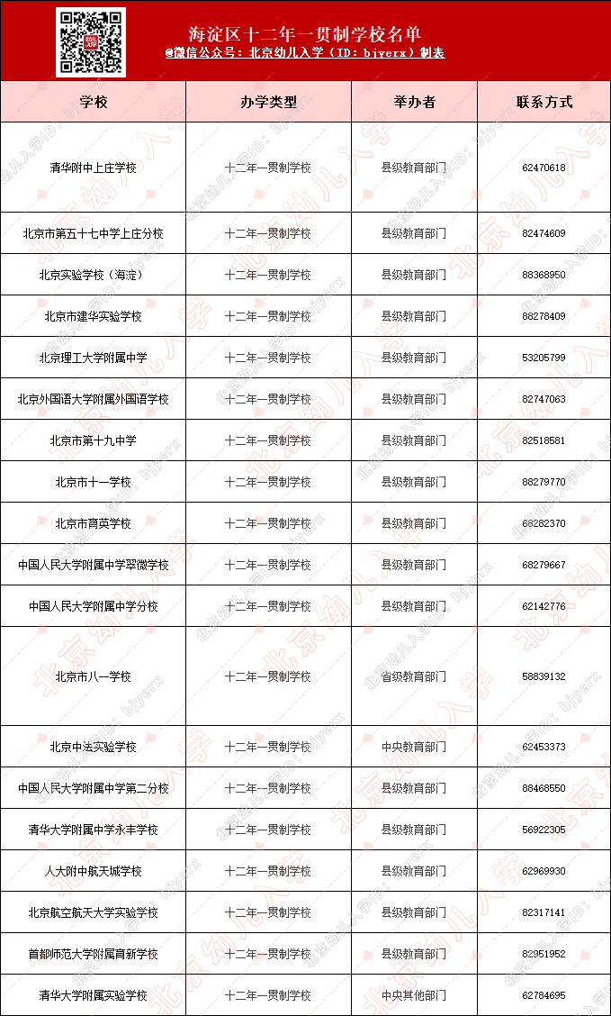 提醒:海淀区公布一贯制学校名单,意向报名家长请务必关注学校招生通知!更多招生信息请持续关注“北京幼儿入学”公众号。