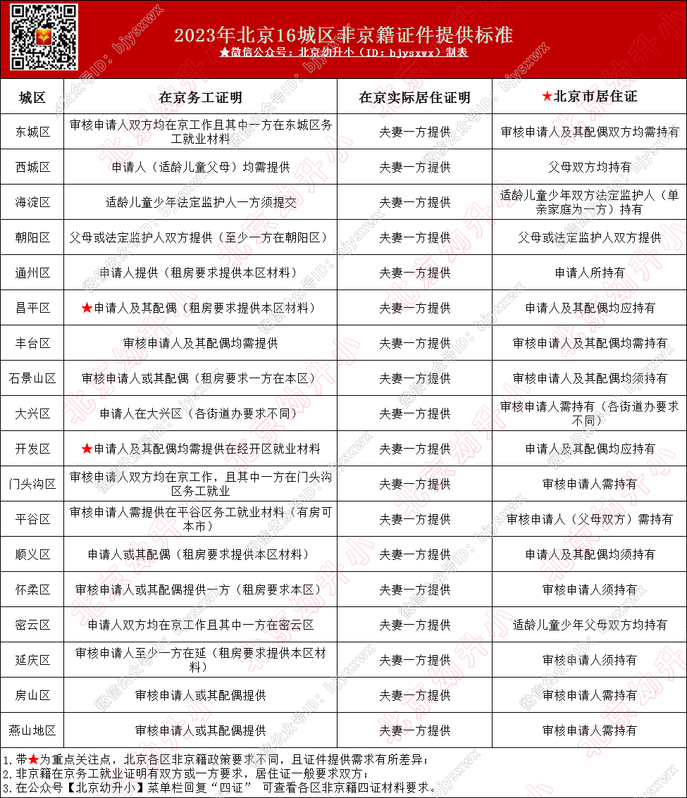 从2023年入学政策来看,北京各区要求不同,家长需根据入学城区政策准备,具体内容如下: