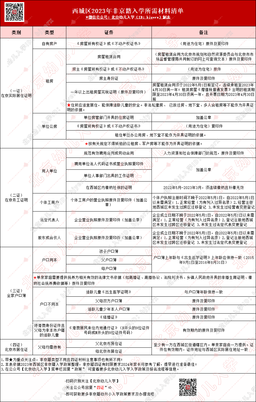 西城区非京籍幼升小仍需准备“四证”材料,部分有时限要求,家长务必关注: