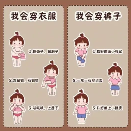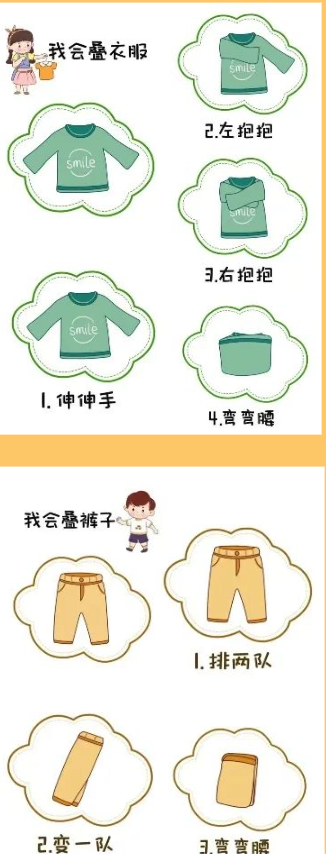 1.家长要为孩子提供方便穿脱的衣裤和鞋子,以便孩子练习,还可以和孩子一起做关于穿脱衣服的手指游戏、听一听儿歌,动手尝试穿脱、叠放衣物。