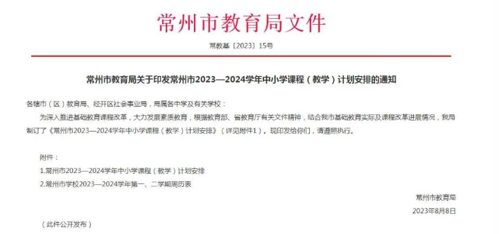 常州市教育局正式公布了常州市学校2023—2024学年开学和寒暑假时间。