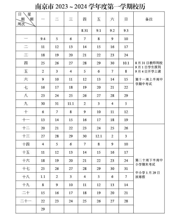 从校历看,第一学期从2023年9月4日至2024年1月28日结束,实际教学时间100天。中小学第二十周下半周(1月17-19日)安排期末考试,2024年1月29日起全市中小学幼儿园放寒假。南京市教育局要求各区教育局和中小学要严格执行校历规定,不得随意更改日程安排。