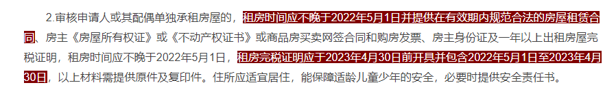 申请人租住房屋的,须提供规范有效的房屋租赁合同、2022年9月30日(含)之前开具的房租发票和房屋出租方的房屋产权证、身份证复印件。所住房屋应适宜居住,能保证适龄儿童少年的安全。