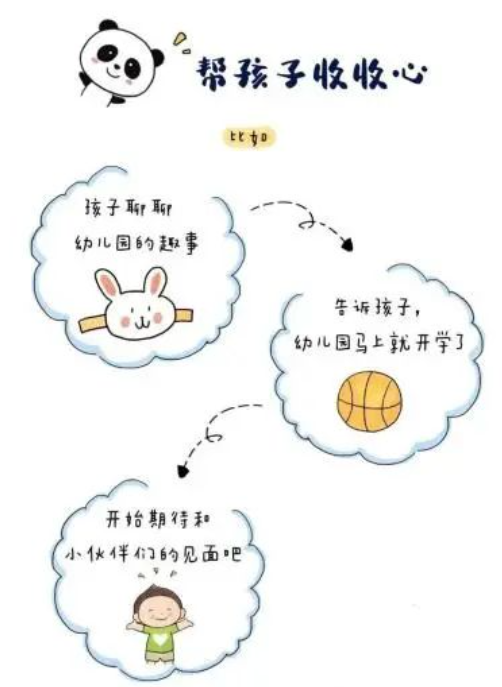 在提醒孩子的时候,要帮助他回忆上个学期在幼儿园开心的事情。比如:和小伙伴愉快的游戏、某个老师说非常喜欢他、或者孩子上学期取得的进步或获得表扬等,这些积极向上的“正能量”会让孩子怀着期待回到幼儿园。