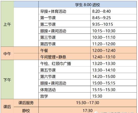 温馨提醒:各区各学校具体时间安排不一致,您可以对照查看持续更新!北京各城区中小学在校作息时间表汇总(早读、上学放学、课后服务、晚自习等时间安排)