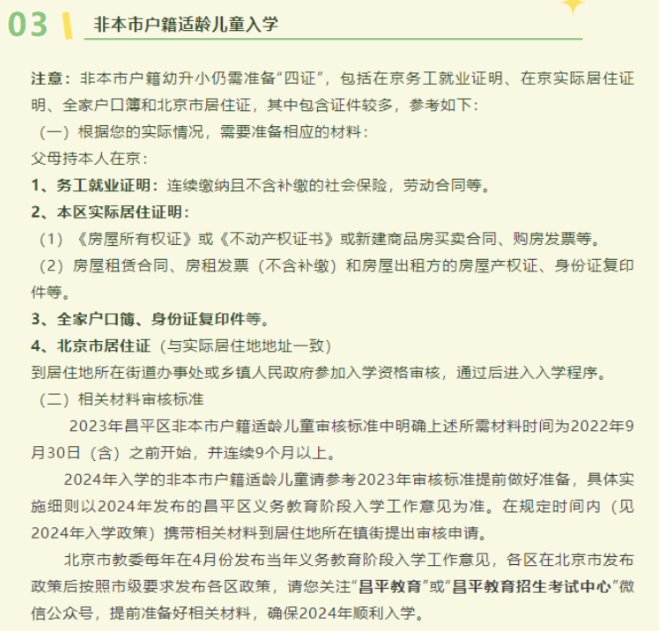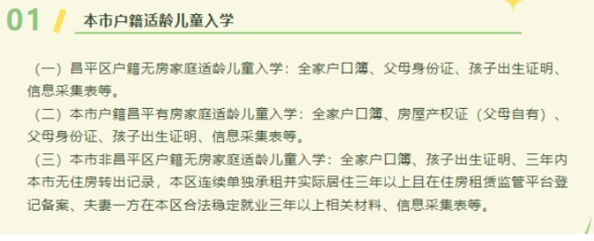 京籍特别需要关注的是,本市非昌平区户籍无房家庭需要提前三年筹备孩子入学事宜,准备好满足要求的社保、租房合同等材料方能在昌平区上小学,如未满足建议回户籍所在地办理入学!