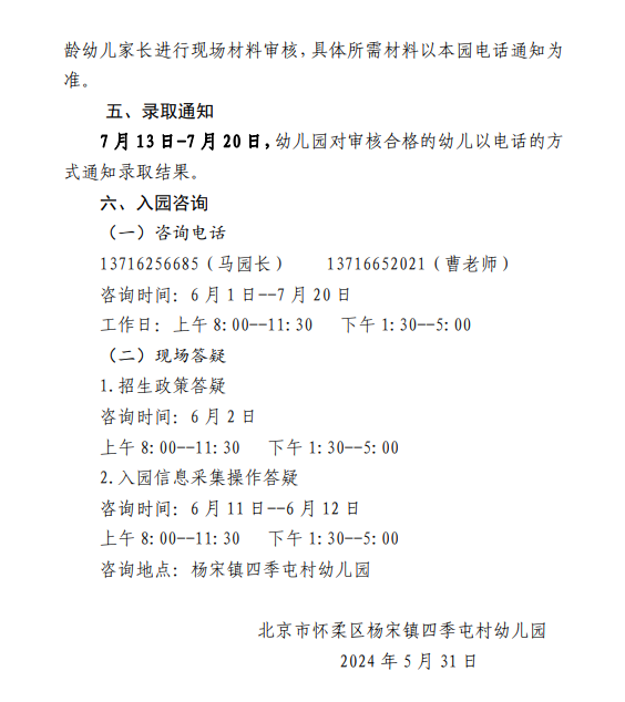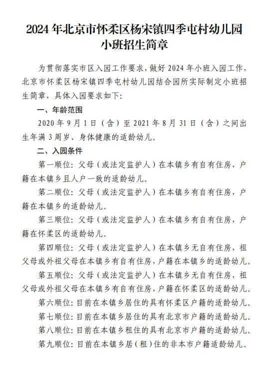 2024年怀柔区杨宋镇四季屯村幼儿园小班招生简章