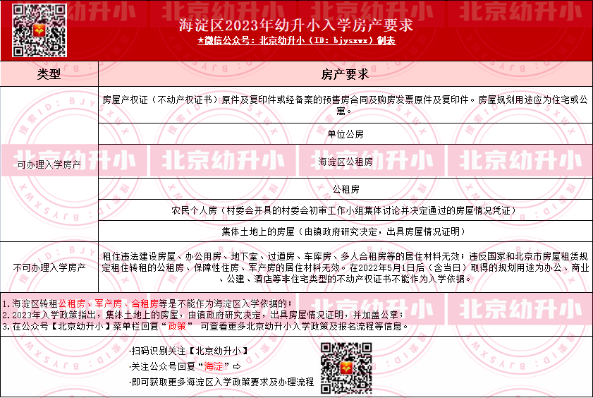 根据2023年海淀区幼升小入学政策要求,海淀区入学房产性质、不可作为入学房产性质要求为,2024年海淀区幼升小家长可先行参考: