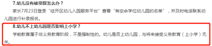参考2023年北京多区幼儿园入园情况来看,学前教育属于非义务教育阶段,不是强制性的。孩子是否上幼儿园,与将来接收义务教育无关,详细内容如下: