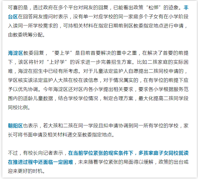 说明:北京多区表示当前学位紧张的现实条件下,多孩家庭子女同校就读在推进过程中面临一定困难,未来或将得到缓解,小柚子也希望各位二孩得家长都能如愿同校!