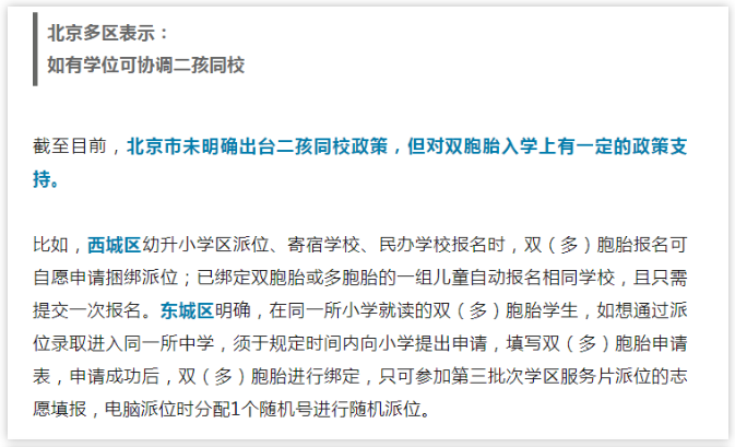 北京市目前暂未明确出台二孩同校政策,各区官方参考如下: